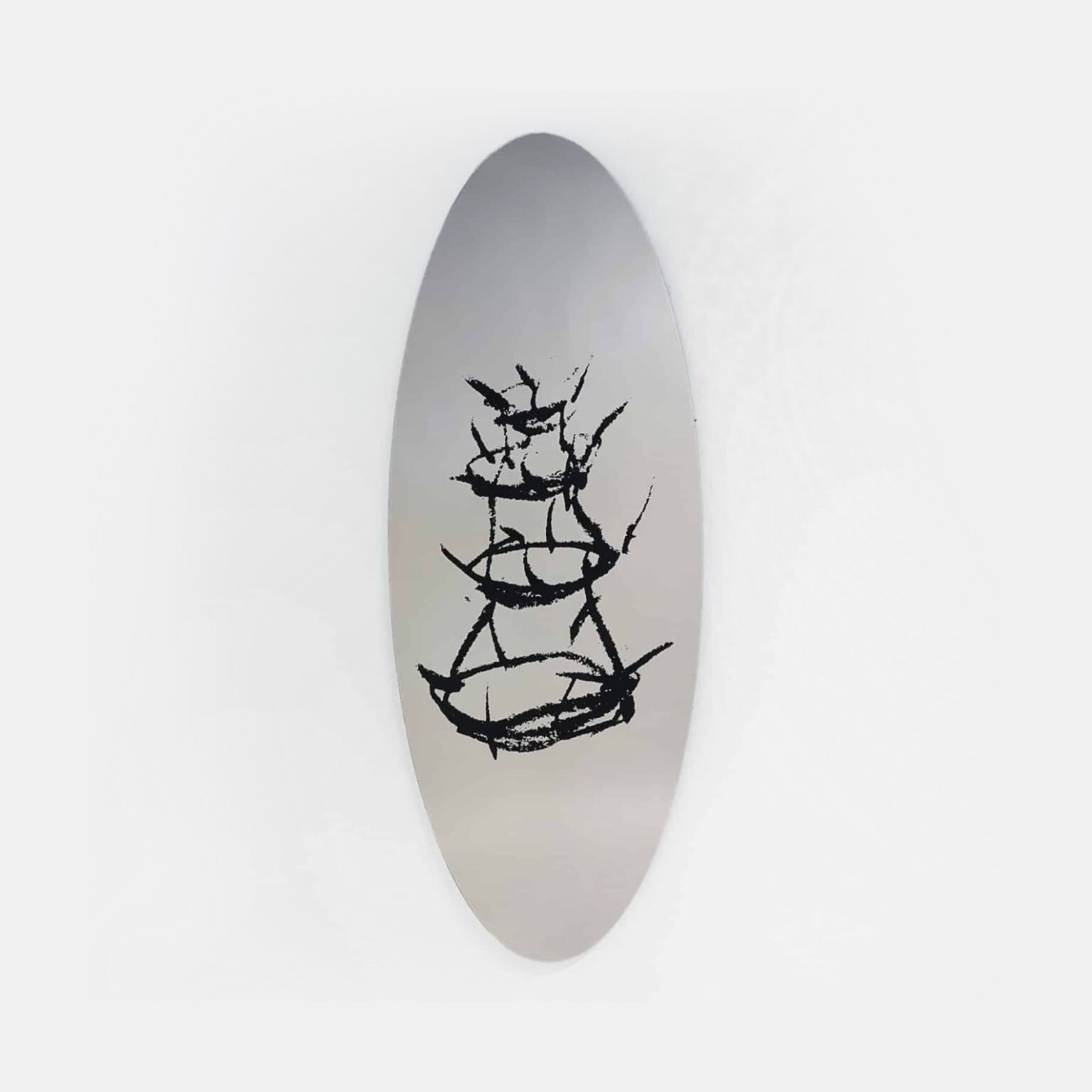 Dit kunstwerk is een hommage aan Marcel Duchamps readymade ‘bottle rack’ en werd ontworpen als kunstzinnig statement door Dino Gavina. De zeefdruk bevindt zich op een spiegelend oppervlak van kunststof, gemonteerd op een houten paneel voor wandpresentatie. Afmetingen: 67,5 x 3,5 x 170 cm. Gemerkt: Centro Duchamp Bologna, Scolabottigle Dino Gavina, omaggio a Marcel Duchamp, serie limitata, Simon Gavina.