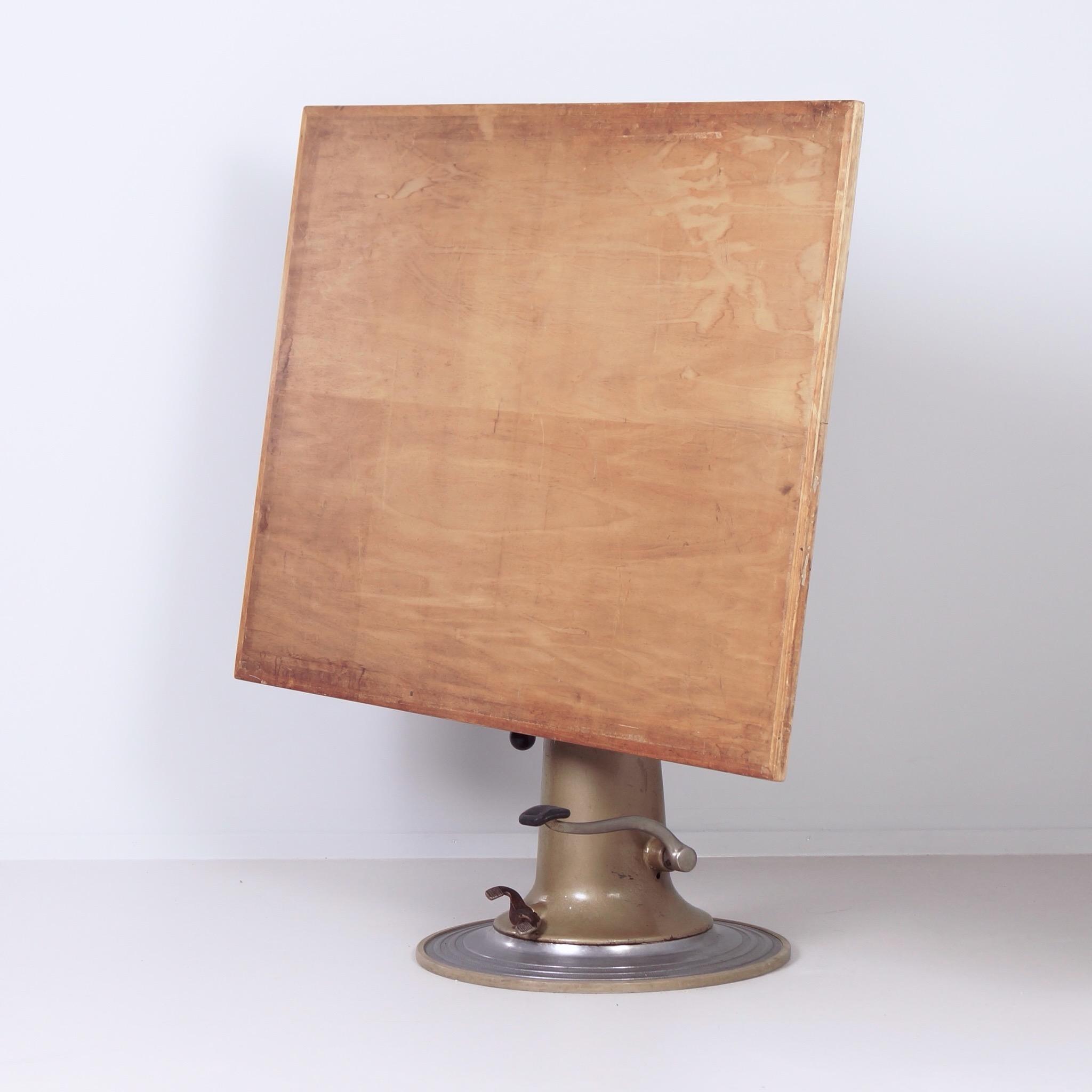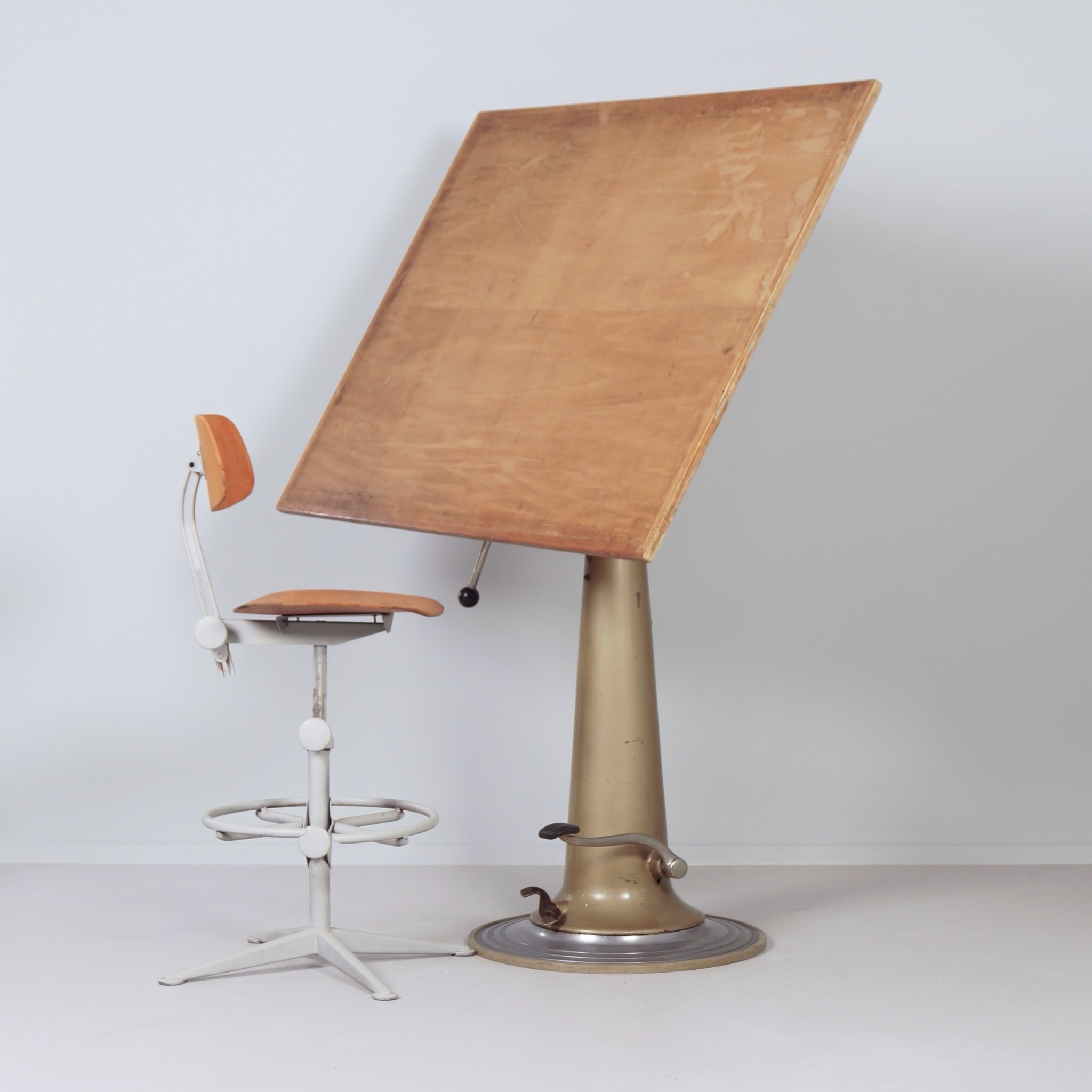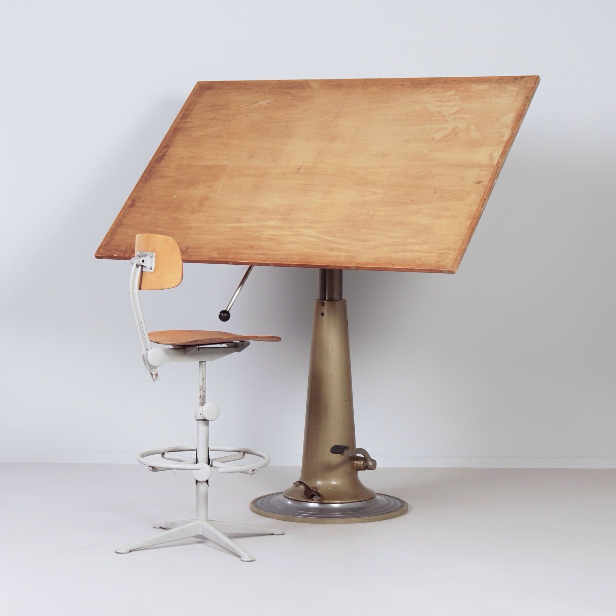 De conditie van deze tekentafel is goed, passend bij de leeftijd. De constructie is solide en de hydrauliek werkt naar behoren. Zichtbare gebruikssporen zijn aanwezig, passend bij intensief gebruik in een atelieromgeving. De prijs is uitsluitend voor de tekentafel, zonder de stoel.