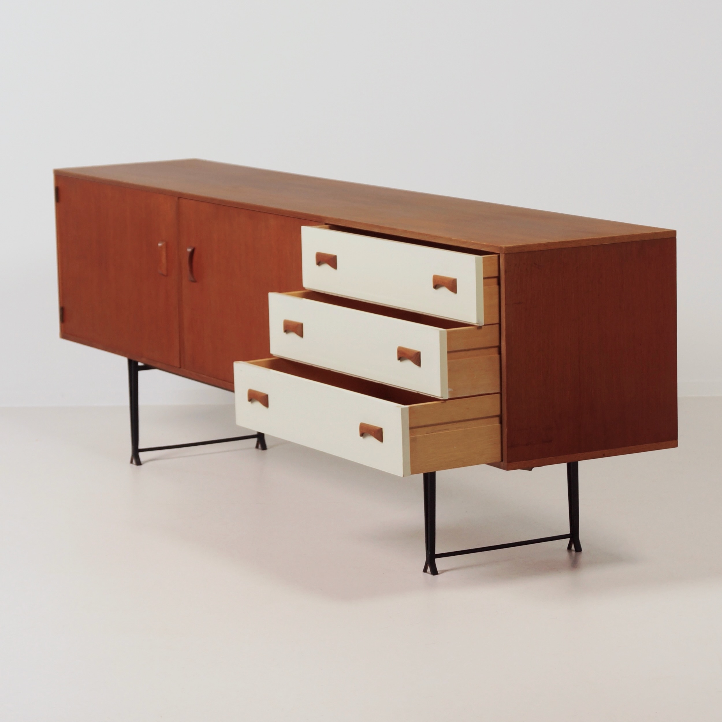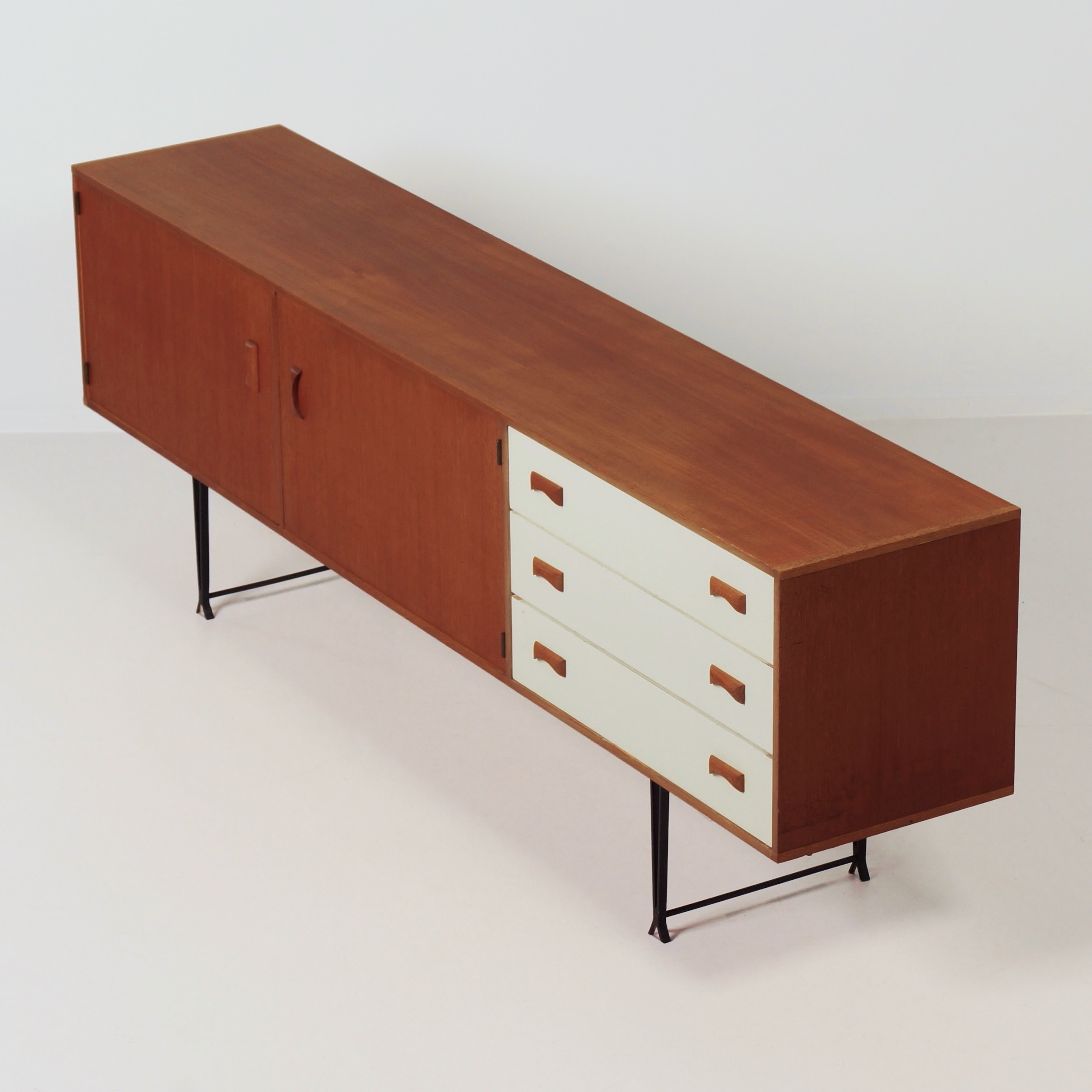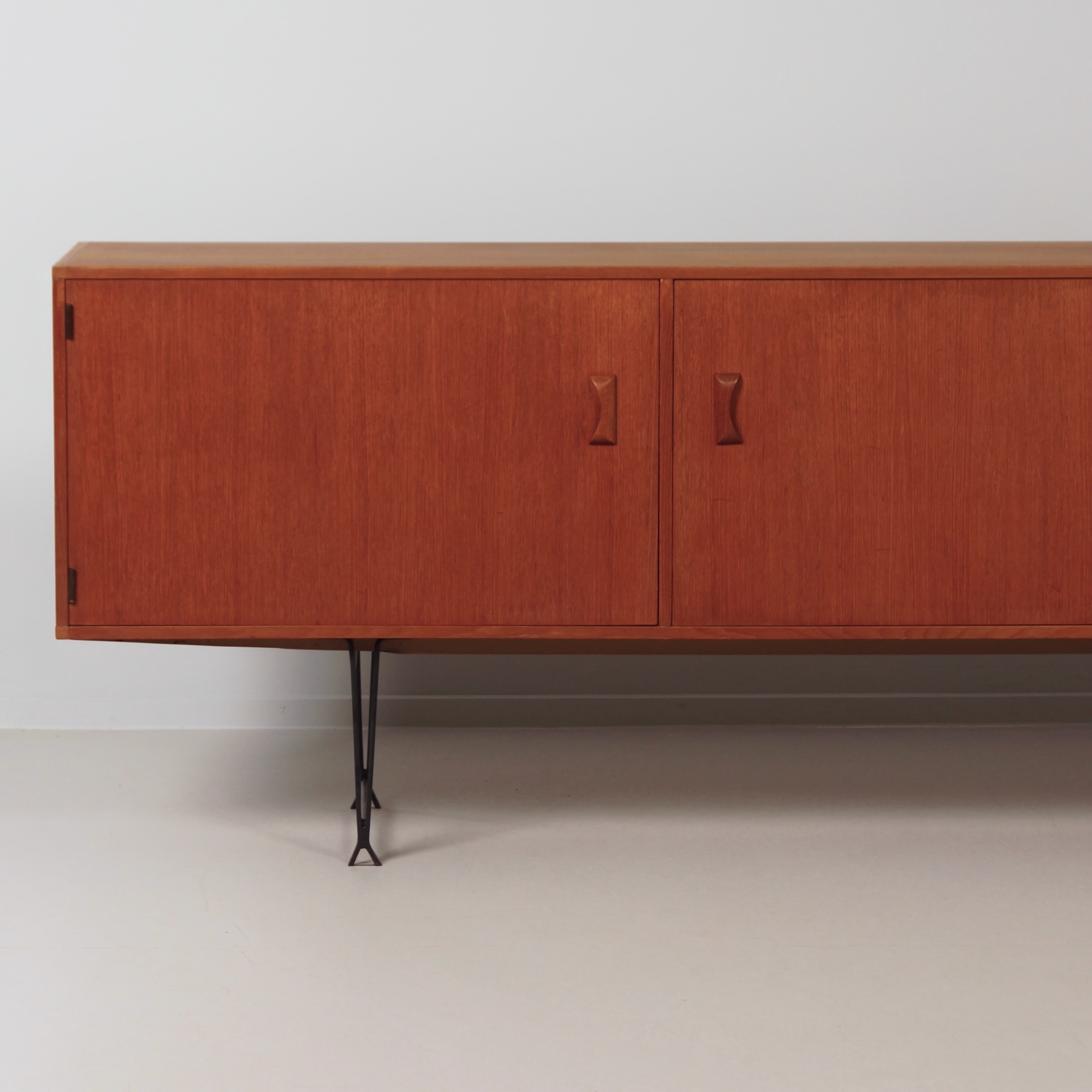 De conditie van dit dressoir is zeer goed. Het teakfineer toont minimale gebruikssporen passend bij de leeftijd en heeft een warme, egale tint. Het zwarte stalen onderstel is stabiel en voorzien van de originele drie-hoekige perspex voetjes.