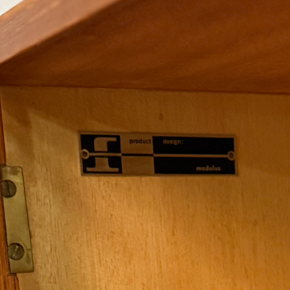 Het dressoir werd ontworpen door Kho Liang Ie voor Fristho Meubelfabriek in Franeker en maakt deel uit van de Modulus-serie, die voortbouwt op ideeën uit de eerdere Modernart-serie van William Watting. In deze periode wordt Kho Liang Ie beschreven als artistiek leider en ontwerper bij Fristho, verantwoordelijk voor de vernieuwende ontwerpkoers eind jaren vijftig, waaronder de Modulus-serie. De serie werd in 1959 exclusief gepresenteerd door Arflex Milano en geldt als een van de meest innovatieve lijnen binnen de Fristho-collectie. Teakhouten deurtjes worden afgewisseld met witte fronten, terwijl het verfijnde zwart stalen V-vormige onderstel het volume optisch laat zweven. Het dressoir is gemerkt met het originele merkplaatje met het door Wim Crouwel ontworpen Fristho-logo en de aanduiding “Modulus”. Afmetingen: 225 × 43 × 76 cm (B×D×H). Bron: Bert Looper, Fristho – vooruitstrevende meubelen 1921–1978, Centraal Museum Utrecht, p. 47–65; Goed Wonen, maart 1959; Fristho Franeker 1920–1978, Kees Draaisma.