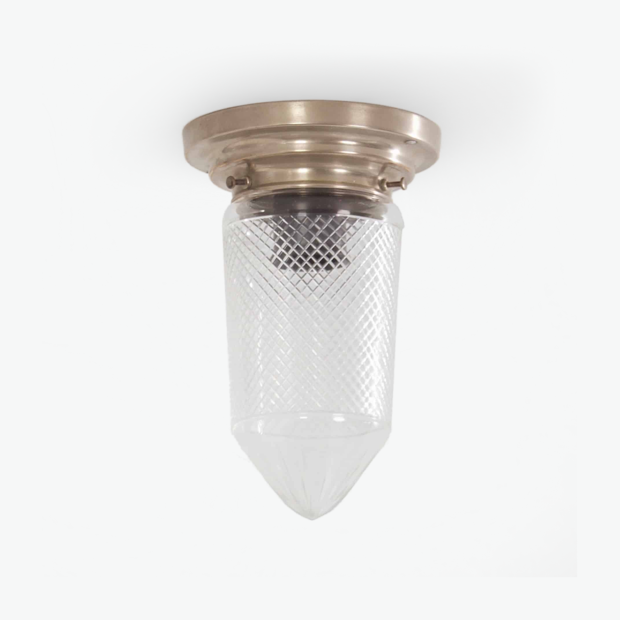 INCL. BTW VOLGENS DE MARGEREGELING (INDIEN RELEVANT)Art Deco plafondlamp uit de jaren dertig met vernikkelde voet en mooi geslepen glazen kap. In de lamp zit een normale fitting, geschikt voor gloeilampen, ledlampen en halogeenlampen. De lamp is nagekeken door een elektricien. Afmetingen: h x d = 20,5 x 13,5 x 13,5 cm. Materiaal: nikkel, metaal en glas. De conditie is nog zeer goed met normale sporen van ouderdom; patina op het nikkel.