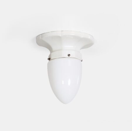 INCL. BTW VOLGENS DE MARGEREGELING (INDIEN RELEVANT)Art Deco plafonnière uit de jaren 30 met een porseleinen plafondplaat en een melkglazen kelk in kegelvorm. De combinatie van wit porselein en opaalglas geeft een zacht, diffuus licht dat goed past bij interieurs in Bauhaus stijl.