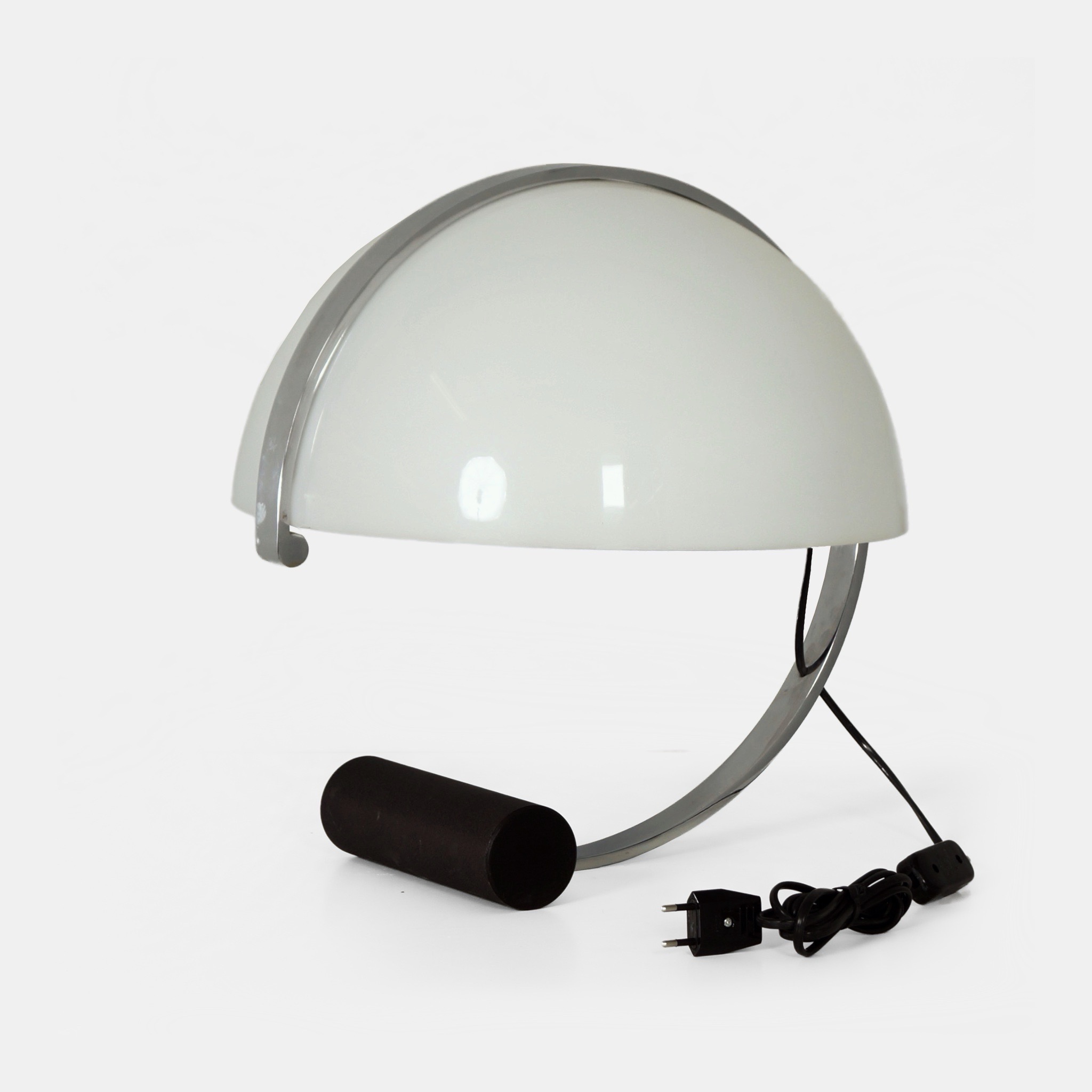 INCL. BTW VOLGENS DE MARGEREGELING (INDIEN RELEVANT)Tafellamp van Stilnovo voor Artimeta uit de jaren 70 in chroom en plexiglas met sculpturale kap – in uitstekende staat en met een opvallend profiel. De ‘Meta’ lamp is een ontwerp van Stilnovo uit Italië, geleverd in Nederland door Artimeta in de jaren zeventig. De lamp is opgebouwd uit massief ijzer met verchroomde afwerking, een zware ronde voet in zwart gelakt staal en een opaalwitte, gewelfde kap van plexiglas. Deze combinatie geeft de lamp een uitgesproken Space Age en Italiaans modern karakter. Afmetingen: 41 x 41 x 40 (H) cm. Bronvermelding: Stilnovo en Artimeta-catalogus (1970).