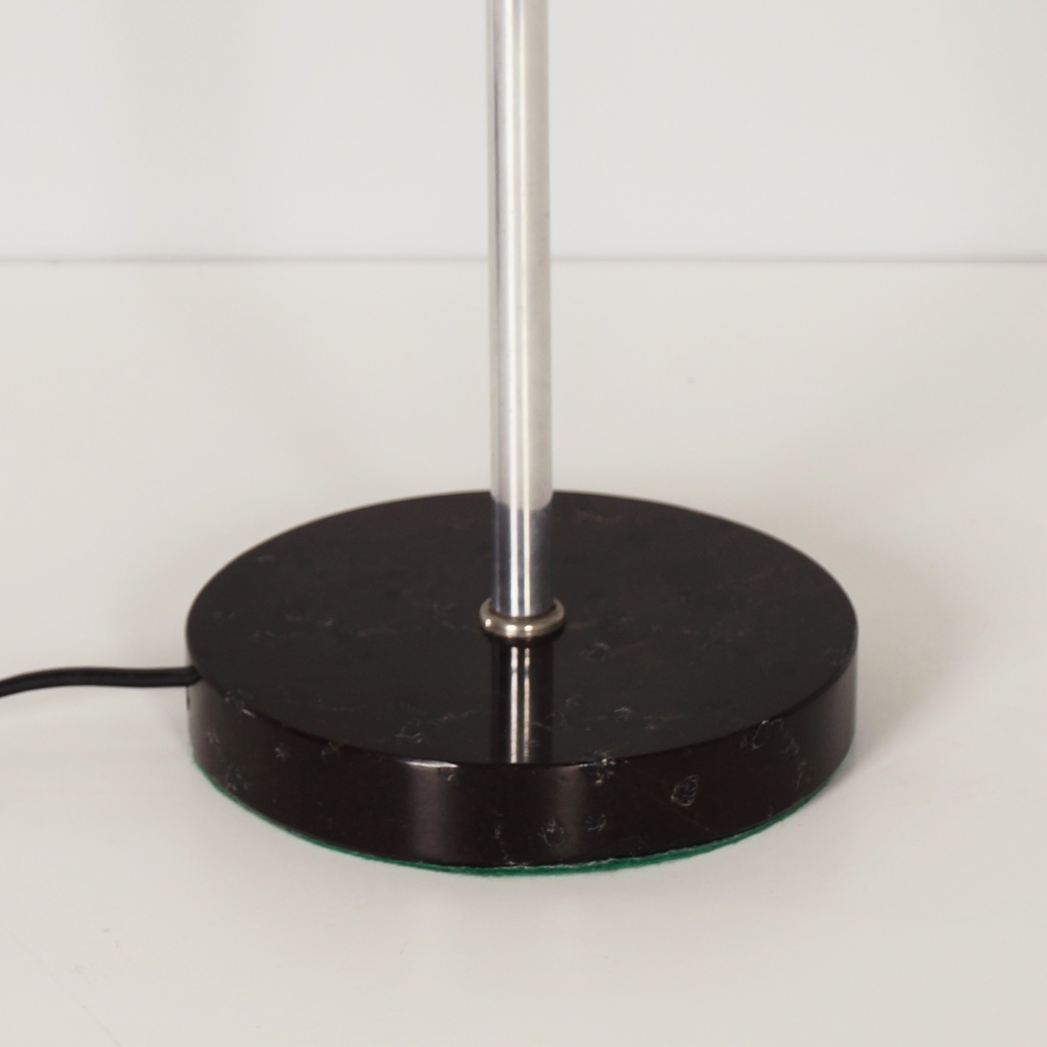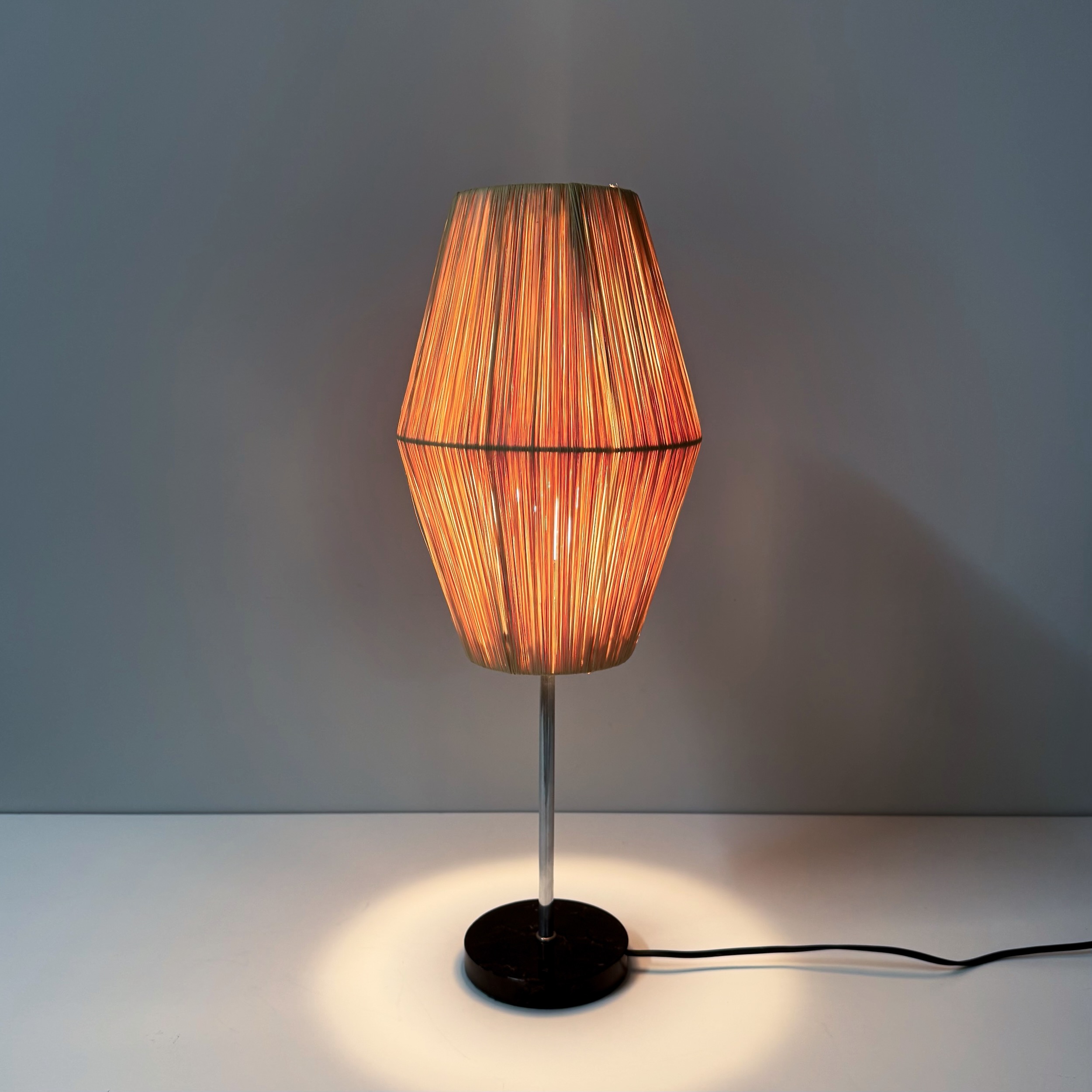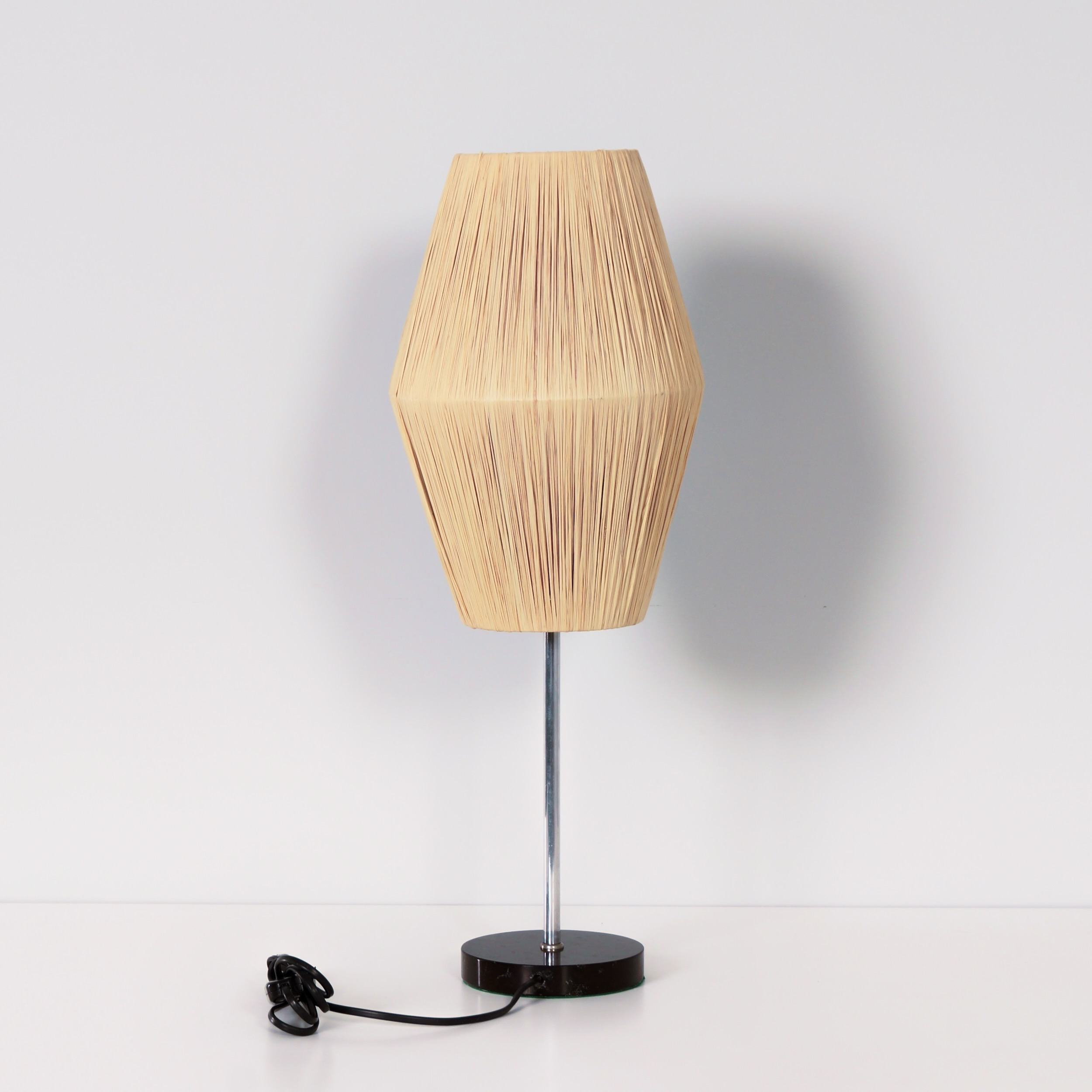 De lamp is uitgevoerd met een handgeknoopte raffia kap op een metalen frame, een chromen staander en een ronde marmeren voet. Voorzien van een E27 fitting. Afmetingen: 22 x 22 x 59 (H) cm. De diameter van de voet is 13 cm. Nederlandse productie, circa 1965.