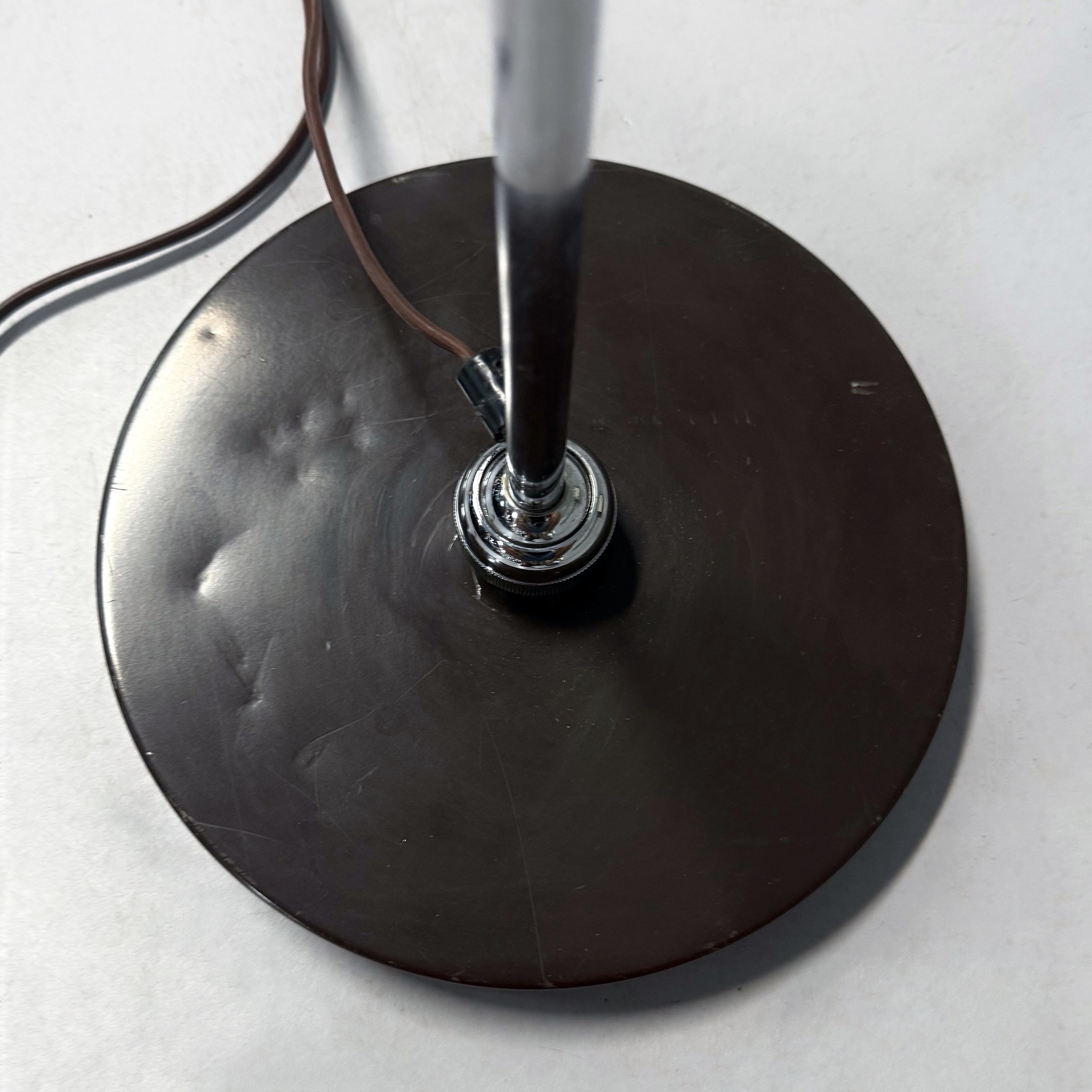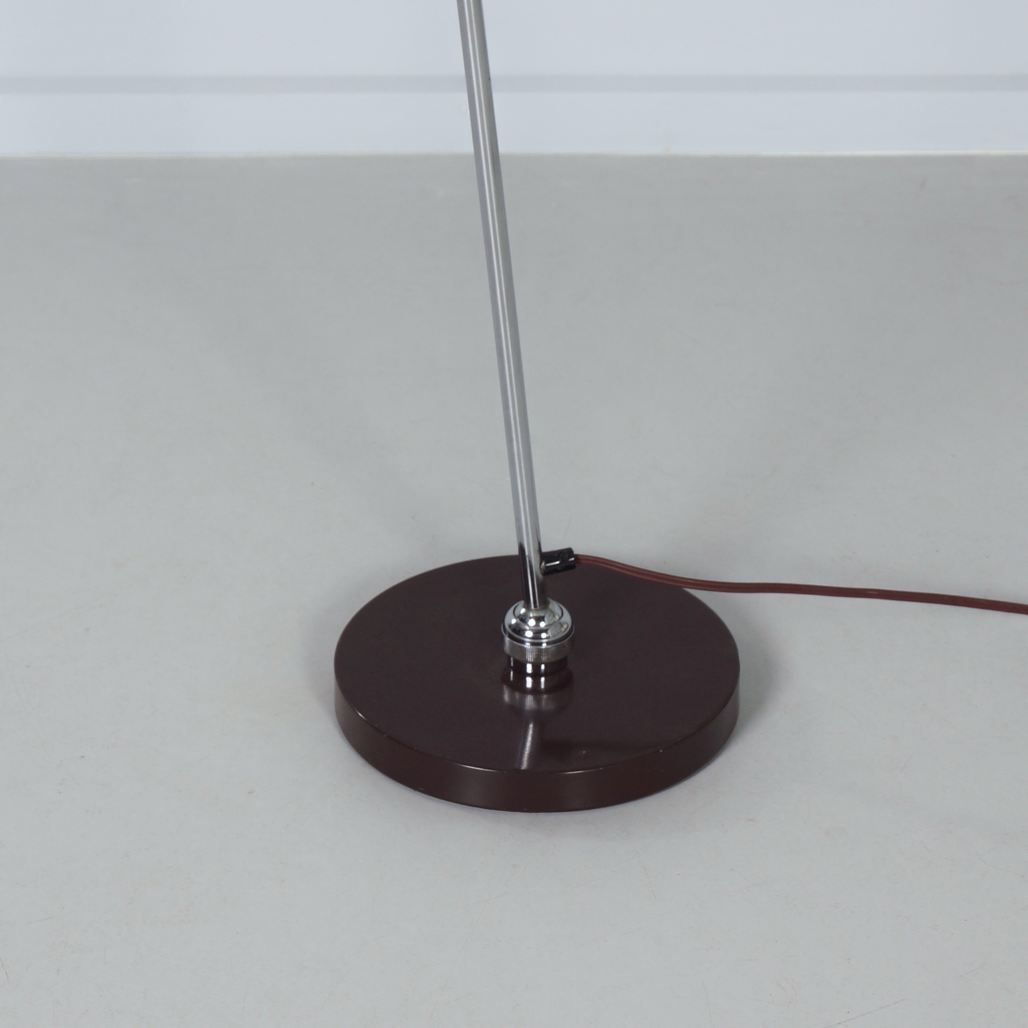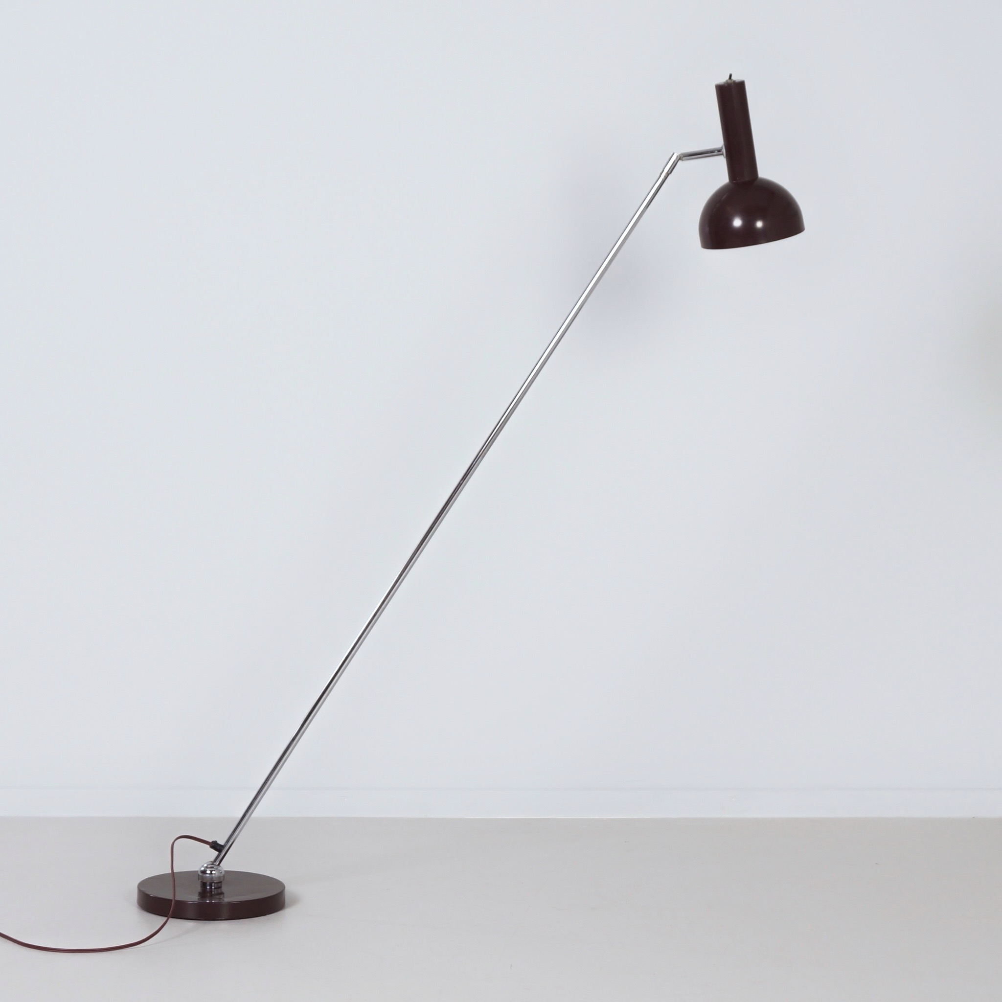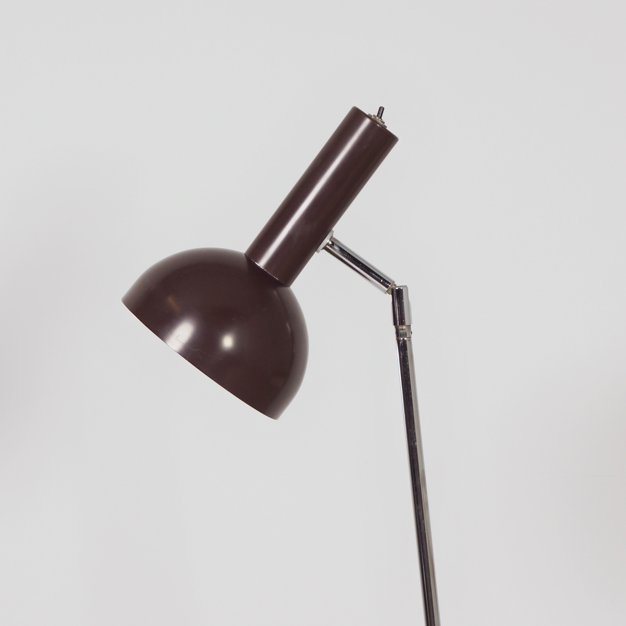 Hala Busquet vloerlamp uit de jaren 60 met bruine gelakte kap, chromen details en een verstelbare staander dankzij het kogelgewricht in de voet.